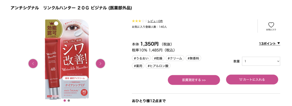 ネット通販では、シワ改善とシミ予防を一本で実現する高い機能性を備えた「リンクルハンター」を、店舗の在庫状況を気にせずいつでも確実に確保できます。
